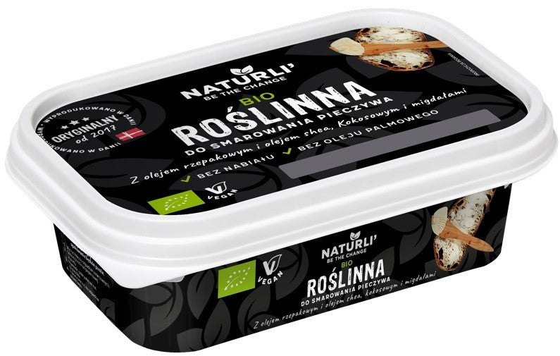 To alternatywa dla masła. Idealna dla wegan. Składa się z ekologicznych olejów wysokiej jakości i nie zawiera mleka. Smakiem przypomina masło z ładgodną migdałową nutą. Ma stałą konsystencję, ale można ją rozprowadzić na pieczywie tuz po wyjęciu z lodówki. Zawiera 75% tłuszczu roślinnego więc nadaje się również do pieczenia i smażenia. SKŁADNIKI: olej rzepakowy* 39%, woda, olej kokosowy* 22%, olej shea* 13%, masa MIGDAŁOWA* 2%, sól, emulgator: lecytyna słonecznikowa, sok z marchwi*, sok z cytryny*, aromat naturalny. *certyfikowane ekologiczne surowce